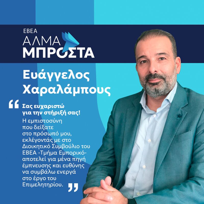 Με αίσθημα βαθιάς ευγνωμοσύνης και τιμής, θα ήθελα να σας ευχαριστήσω θερμά για την εμπιστοσύνη που δείξατε στο πρόσωπό μου, εκλέγοντάς με στο Διοικητικό Συμβούλιο του ΕΒΕΑ. Η εμπιστοσύνη σας αποτελεί για μένα πηγή έμπνευσης και ευθύνης να συμβάλω ενεργά στο έργο του Επιμελητηρίου.